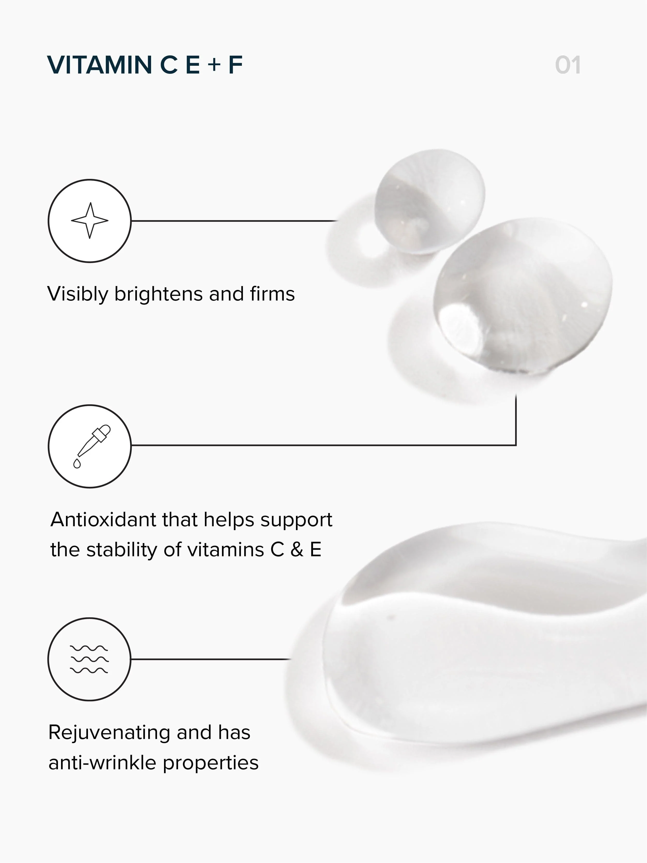 Vitamin C E + F: A potent antioxidant that brightens dull skin, evens tone, and helps protect against environmental stressors. Designed for daily morning use to jumpstart your glow and improve skin clarity over time.